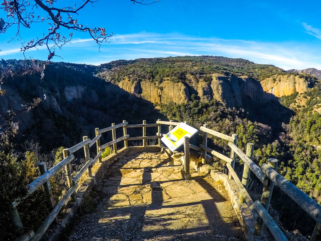 Llegamos a la ermita, y aquí el sendero desciende una pequeña pasarela hasta el mirador de San Voto. Aquí podemos contemplar el Monasterio Viejo desde las alturas aún lado, y el Pirineo al otro.