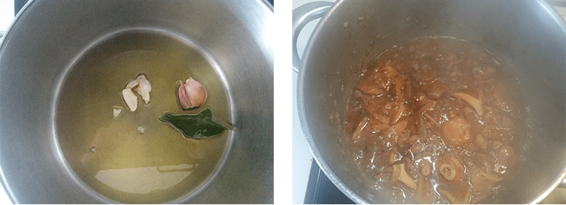 Pondremos en la cazuela los trozos de pollo, los ajos y el laurel y dejaremos que se vaya reduciendo el agua que sueltan las setas. Entonces incorporaremos los dos tipos de vino y el coñac, dejando que durante unos minutos se vaya evaporando el alcohol.