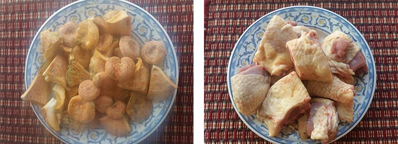 Limpiamos las setas ayudándonos de un paño húmedo. No es recomendable lavarlas. Si la seta es muy grande la cortamos en varios trozos. El pollo pediremos en la carnicería que nos lo den cortado en trozos grandes. Salpimentamos.