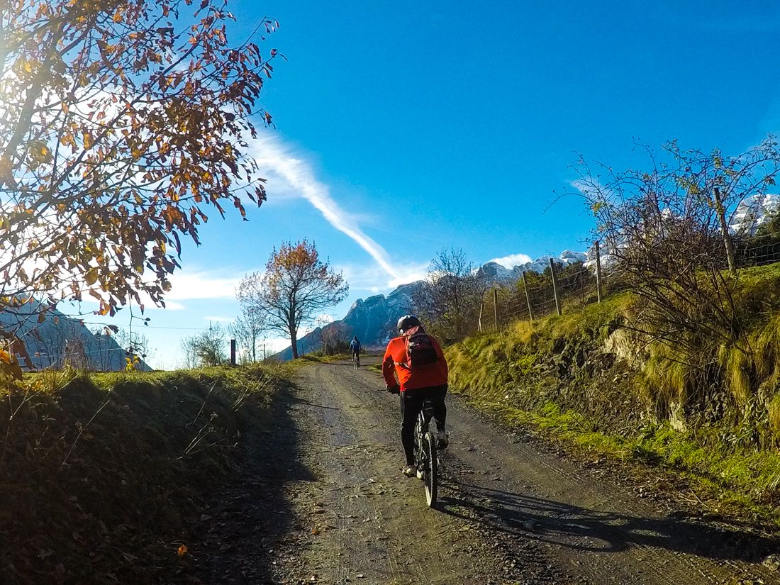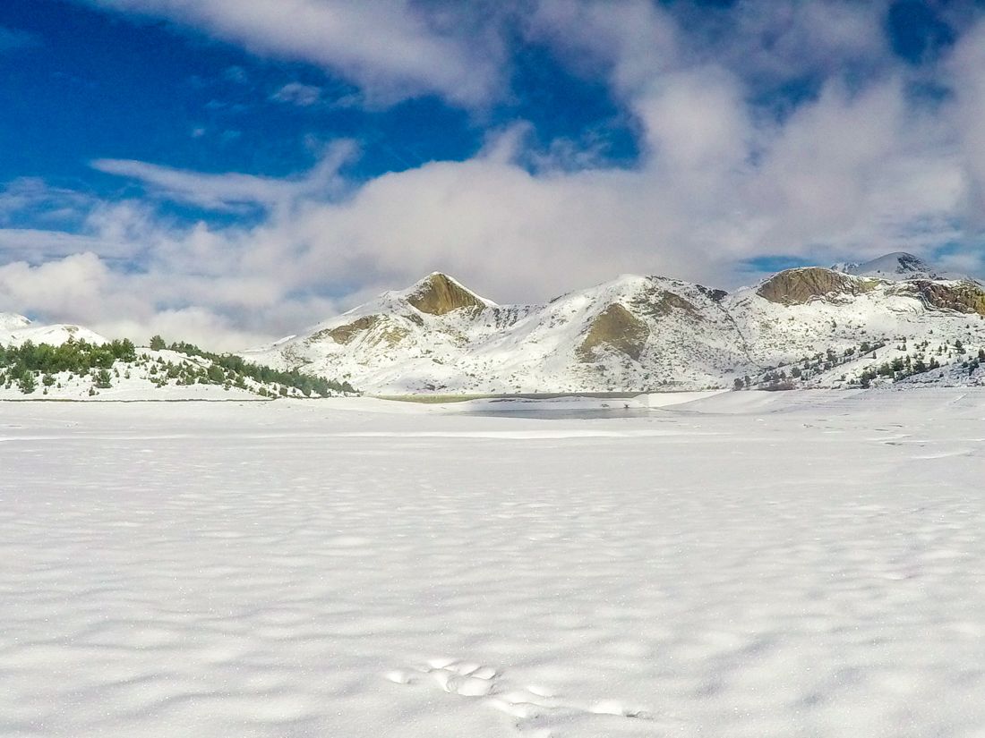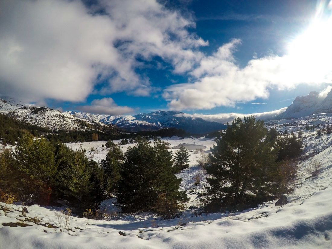 Superado el mayor desnivel, el camino comienza a llanear. Ahora sí ya estamos rodeados de nieve. En estos pastos se posa con facilidad y nos ofrece las vistas invernales que tanto habíamos esperado. Si queremos podemos usar las raquetas de nieve.