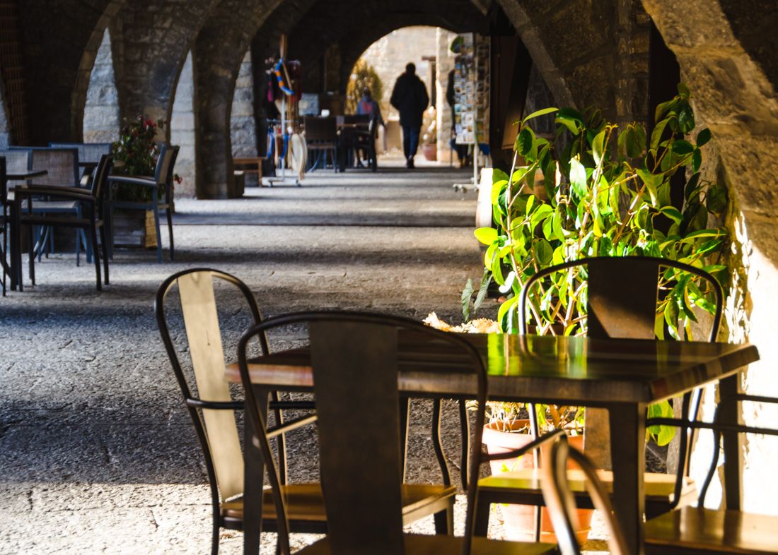 Las terrazas de los comercios ocupan el interior de los arcos de la plaza, lugar de tránsito de los visitantes de la Villa.