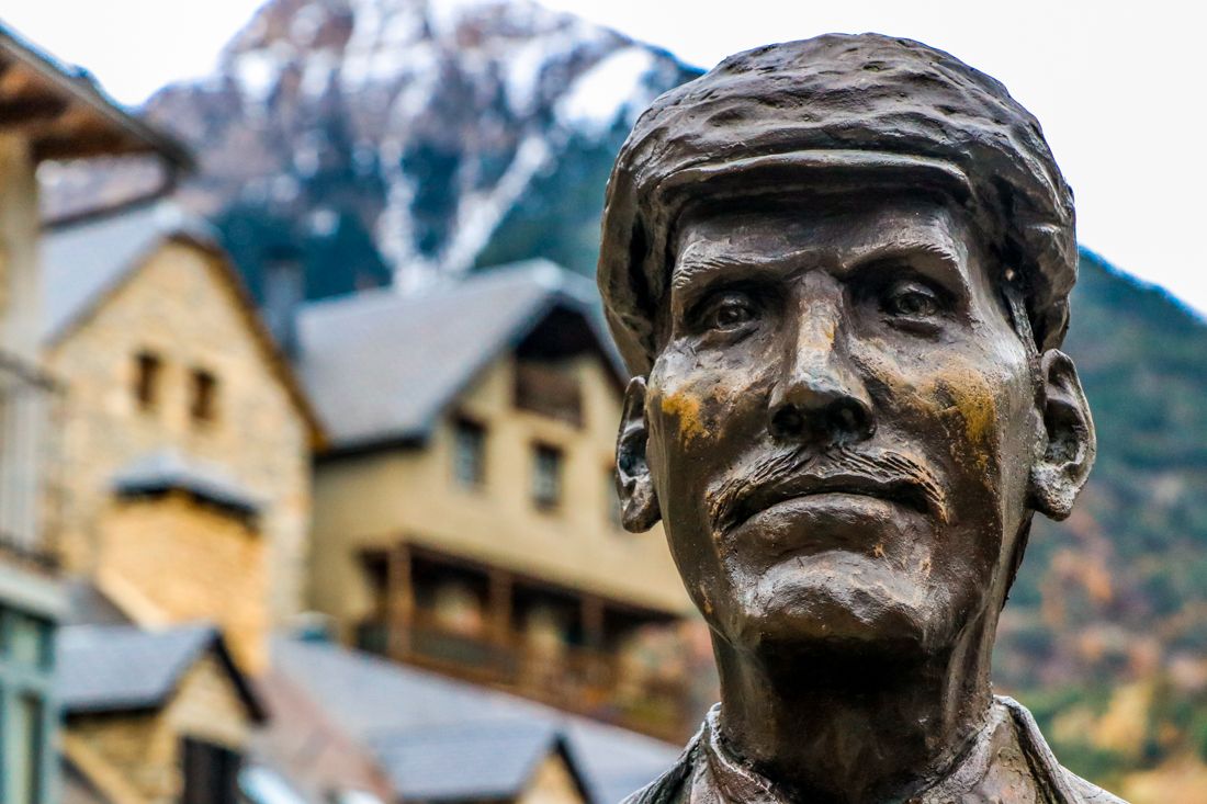 Seguimos nuestro camino por las calles de Sallent de Gállego y pronto llegamos a la plaza. Aquí una estatua en tamaño real recuerda a Fermín Arrudi, más conocido como «o chigant de Sallent», que llegó a ser famoso en todo el Pirineo por su estatura de 2,29m.