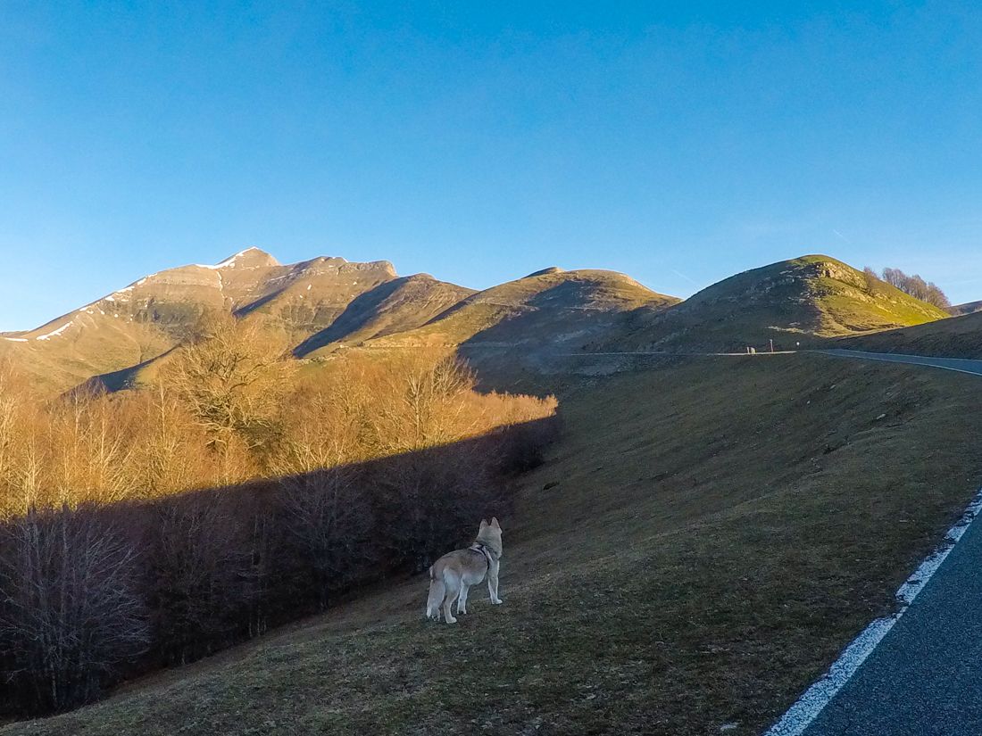 A pesar de la falta de lluvias y la ausencia de nieve, encontramos la carretera del puerto de Larrau cerrada. Así que dejamos el coche junto al Centro de Esquí Nórdico Abodi. Desde aquí ya podemos observar la cima del Orhi. Ahí nos dirigimos.