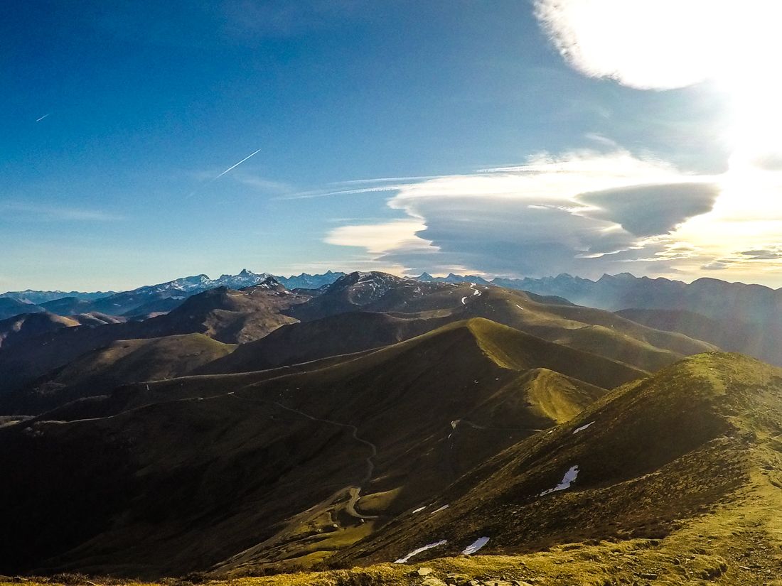 En unos 30′ alcanzamos el aparcamiento junto al túnel y aquí la senda se vuelve muy evidente. A nuestra izquierda no perdemos de vista el Orhi en ningún momento y a nuestra derecha se dibujan imponentes las grandes cimas del Pirineo.