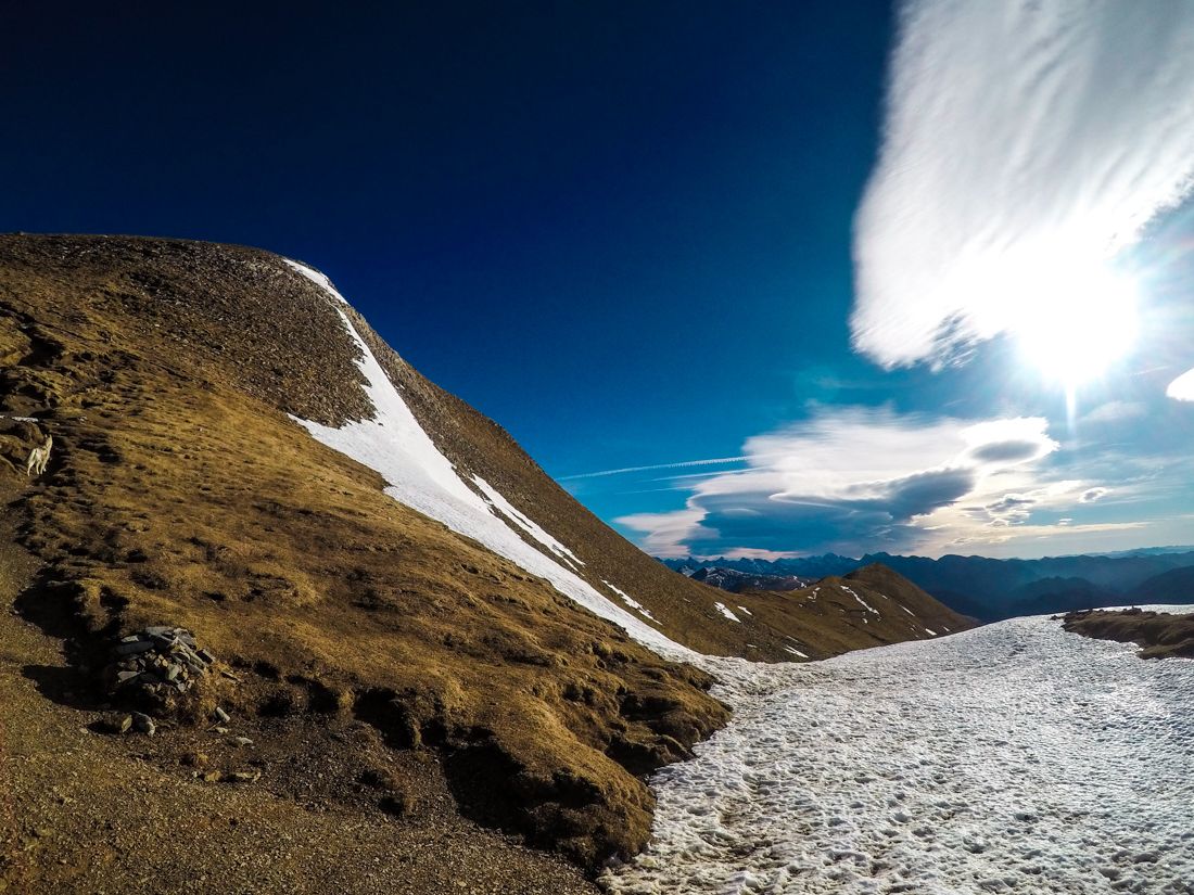 Proseguimos la ascensión, siempre por la margen sur de la cresta y en una hora más alcanzaremos el collado del Orhi. Aquí suele haber un nevero así que hay que tener cuidado con la nieve y valorar el uso de crampones. Ahora ya, en unos 15′ más llegaremos a la cima.