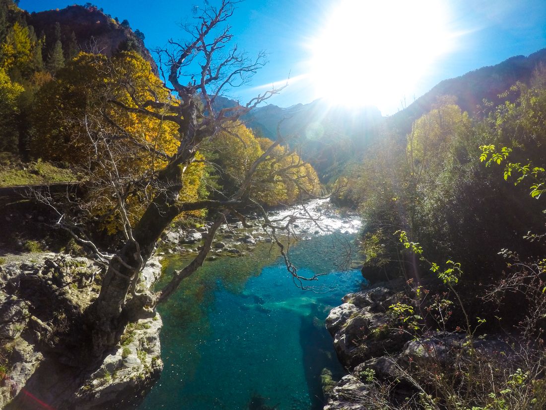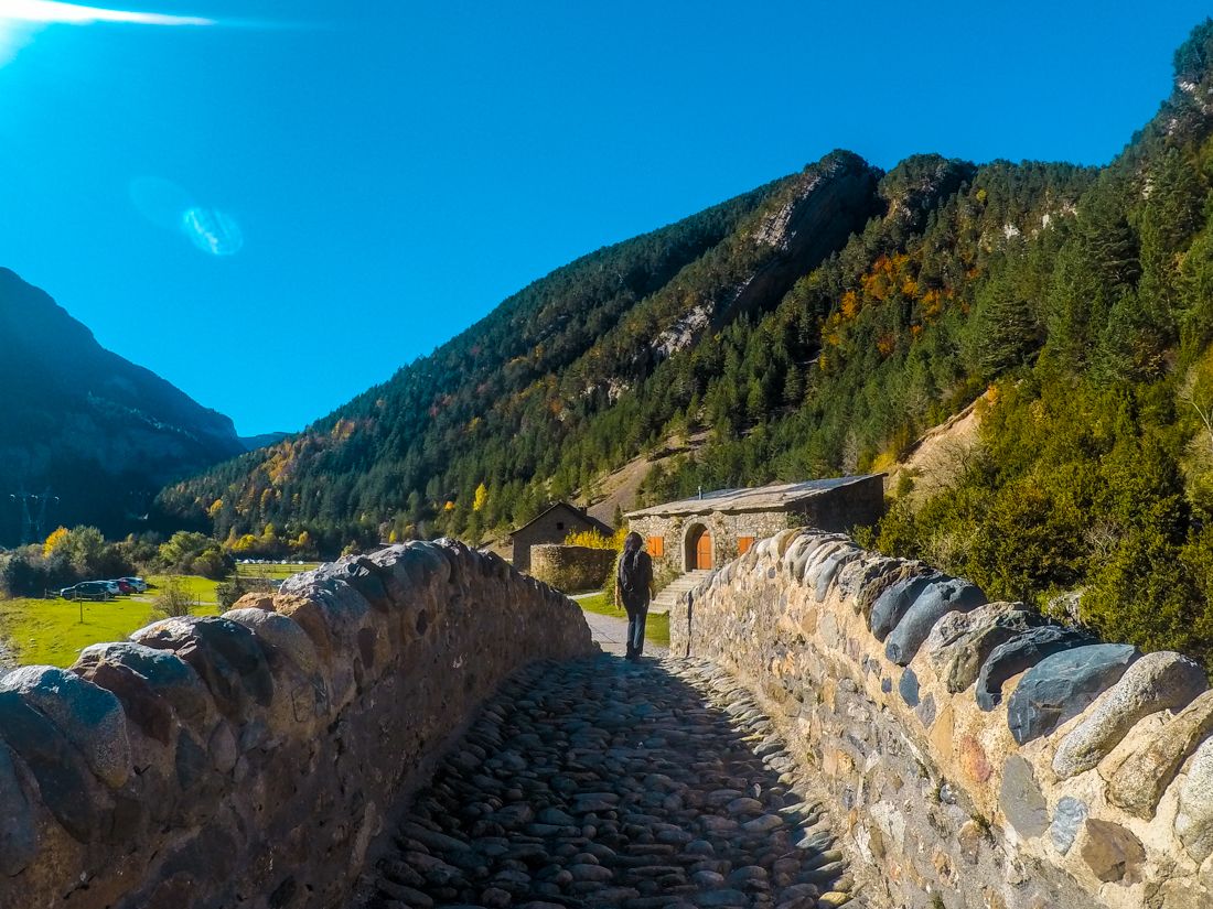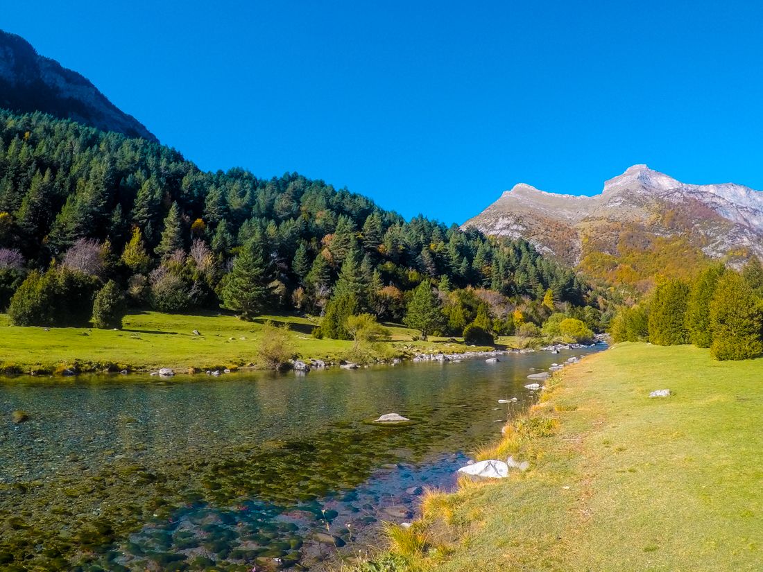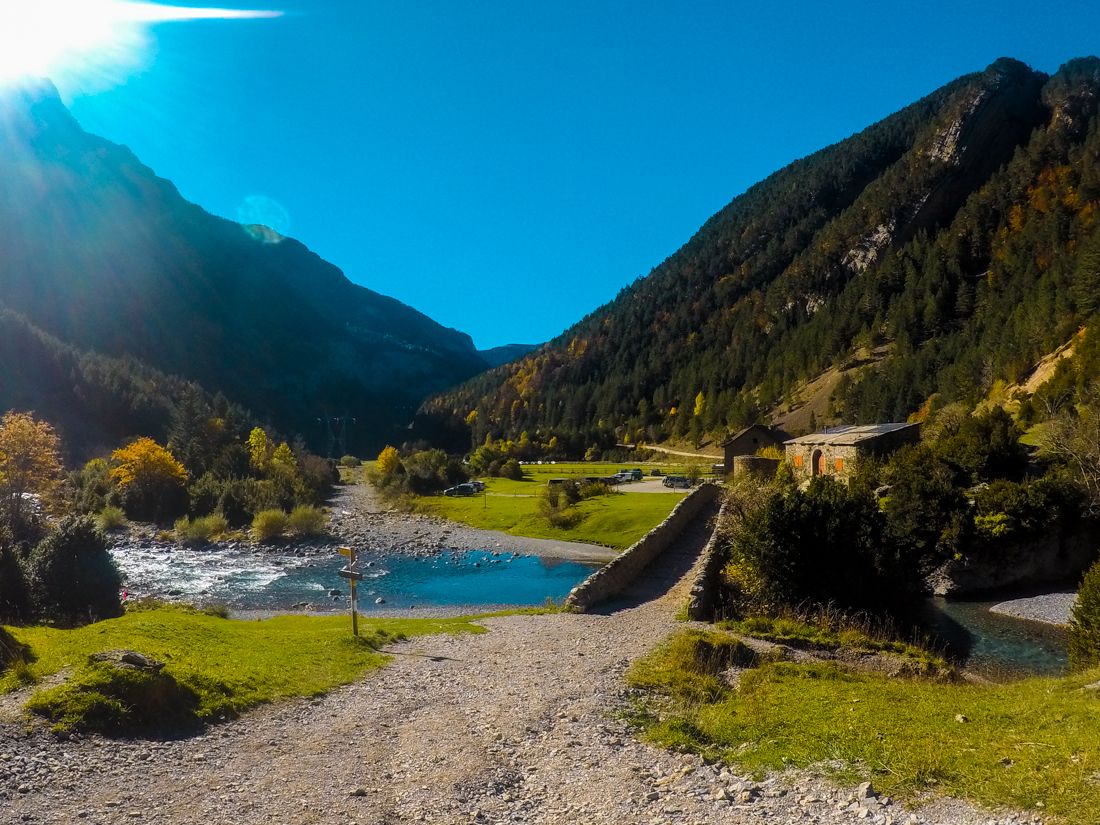 La ruta circular recorre ambas márgenes del río y comienza y acaba en el mítico puente medieval de Bujaruelo, junto al Refugio de mismo nombre. Apenas tiene desnivel y ninguna dificultad, lo que la convierte en una opción perfecta para ir con niños.