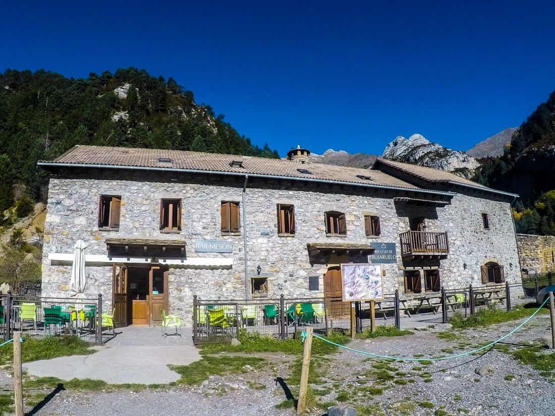 La ruta comienza en el Refugio de Bujaruelo. Aquí hay un parking donde podemos aparcar sin problemas. La senda comienza junto al Refugio por la pista que asciende el valle. Seguimos las aguas del río Ara por su margen izquierda.